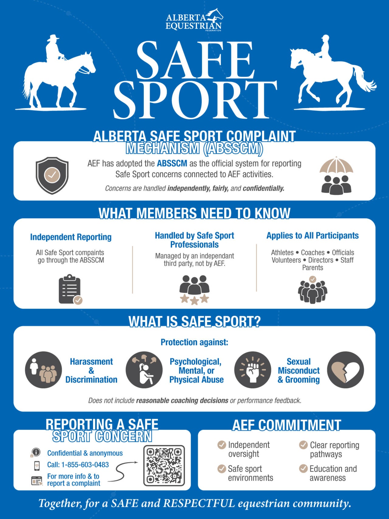 All complaints, whether related to Safe Sport or other conduct concerns, must first be submitted through the ABSSCM, which is coordinated provincially by the Alberta Sport Leadership Association (ASLA) and administered by ALIAS, Alberta’s Independent Third Party Mechanism (ITPM). This ensures all concerns connected to AEF are reviewed confidentially and independently from AEF, and directed to the appropriate process with safeguards in place for everyone involved.